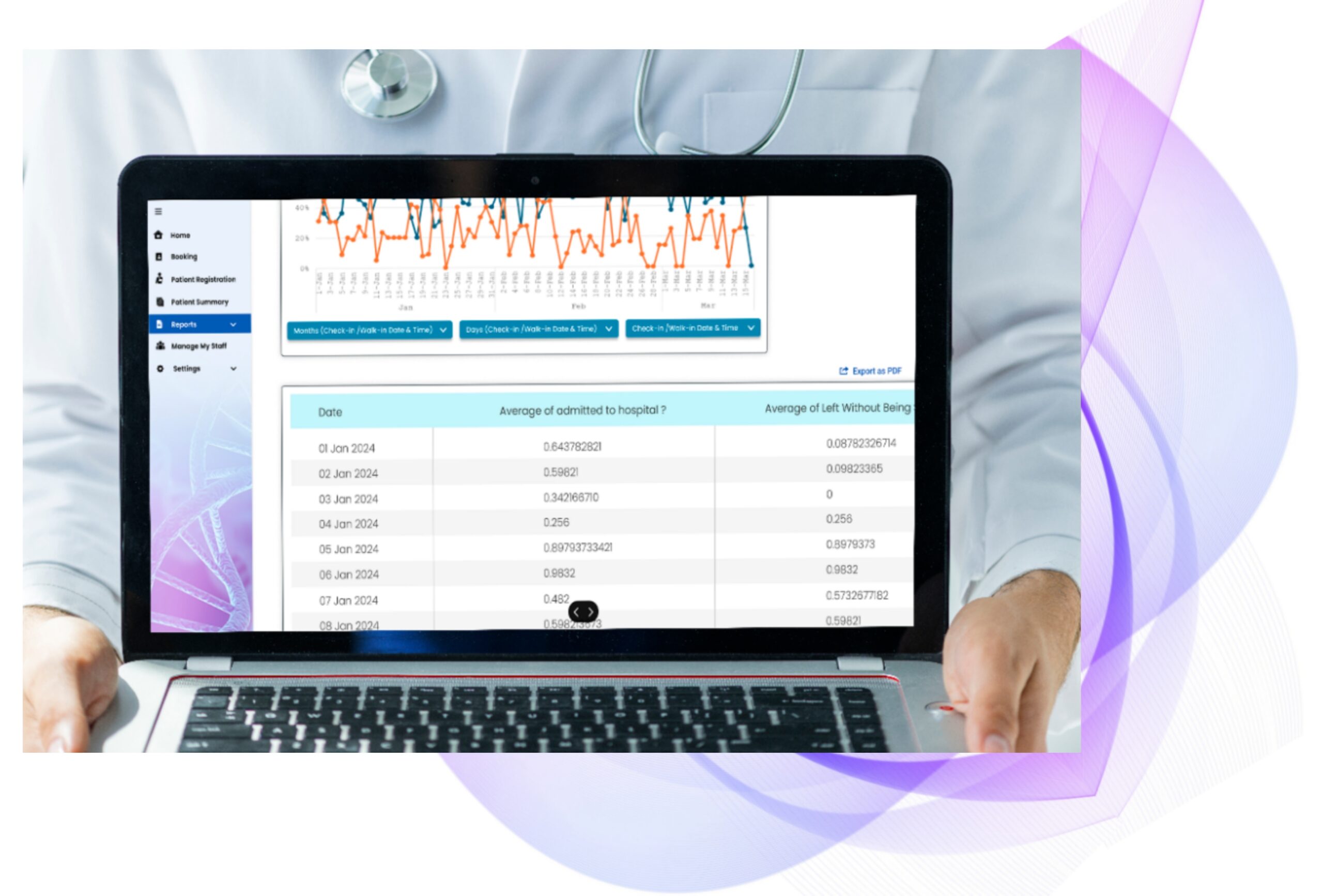 Access vital insights with our reporting feature, providing key data on Average Duration Metrics and LWBS for optimized administration and enhanced patient care.